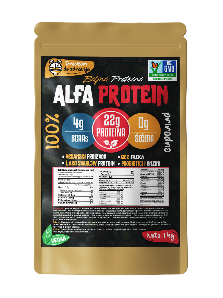 je sirovi, veganski proizvod, bez šećera, bez mlečnih sastojaka, bez trans masnih kiselina i bez genetski modifikovanih sastojaka. Alfa protein je......